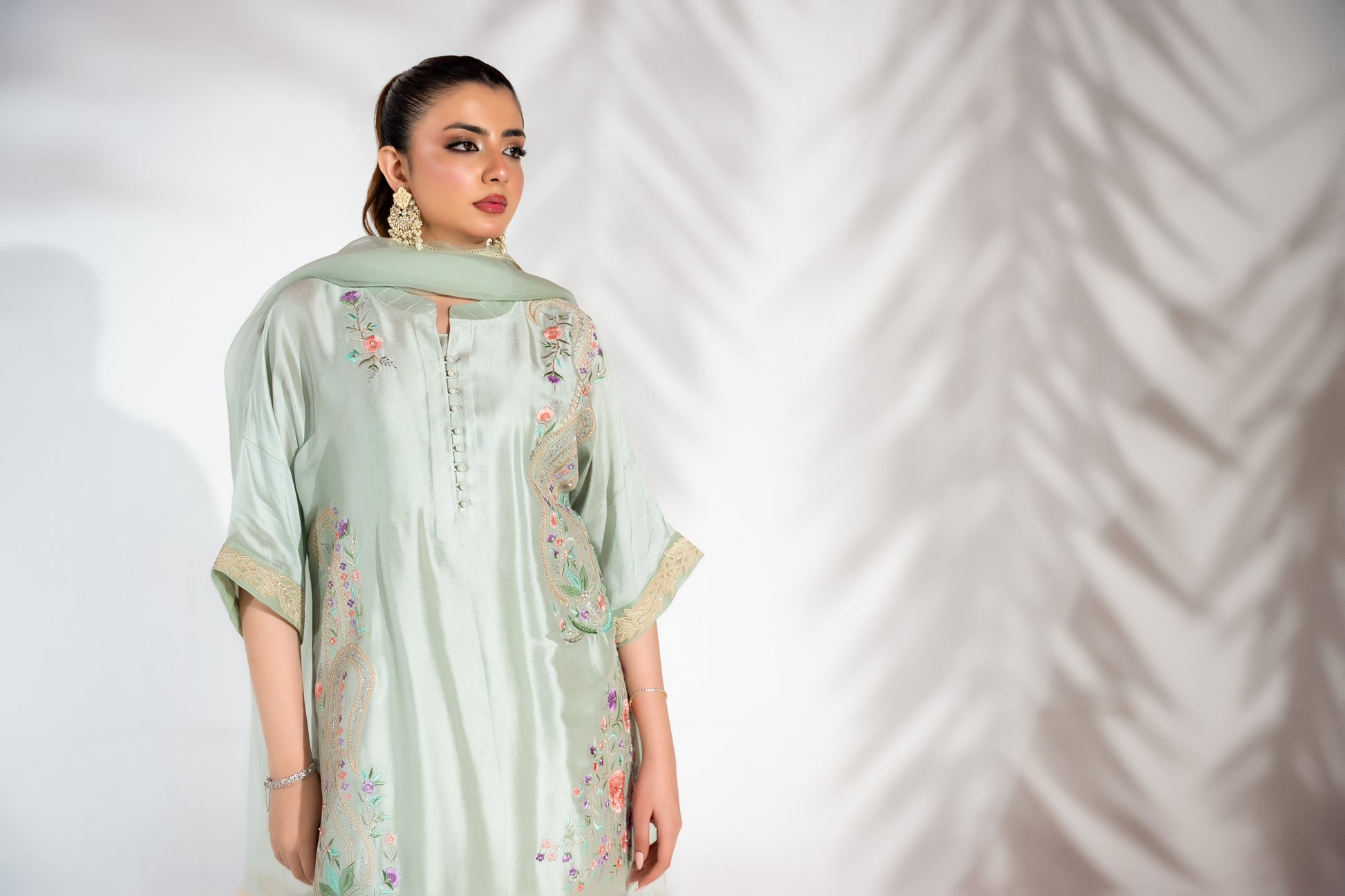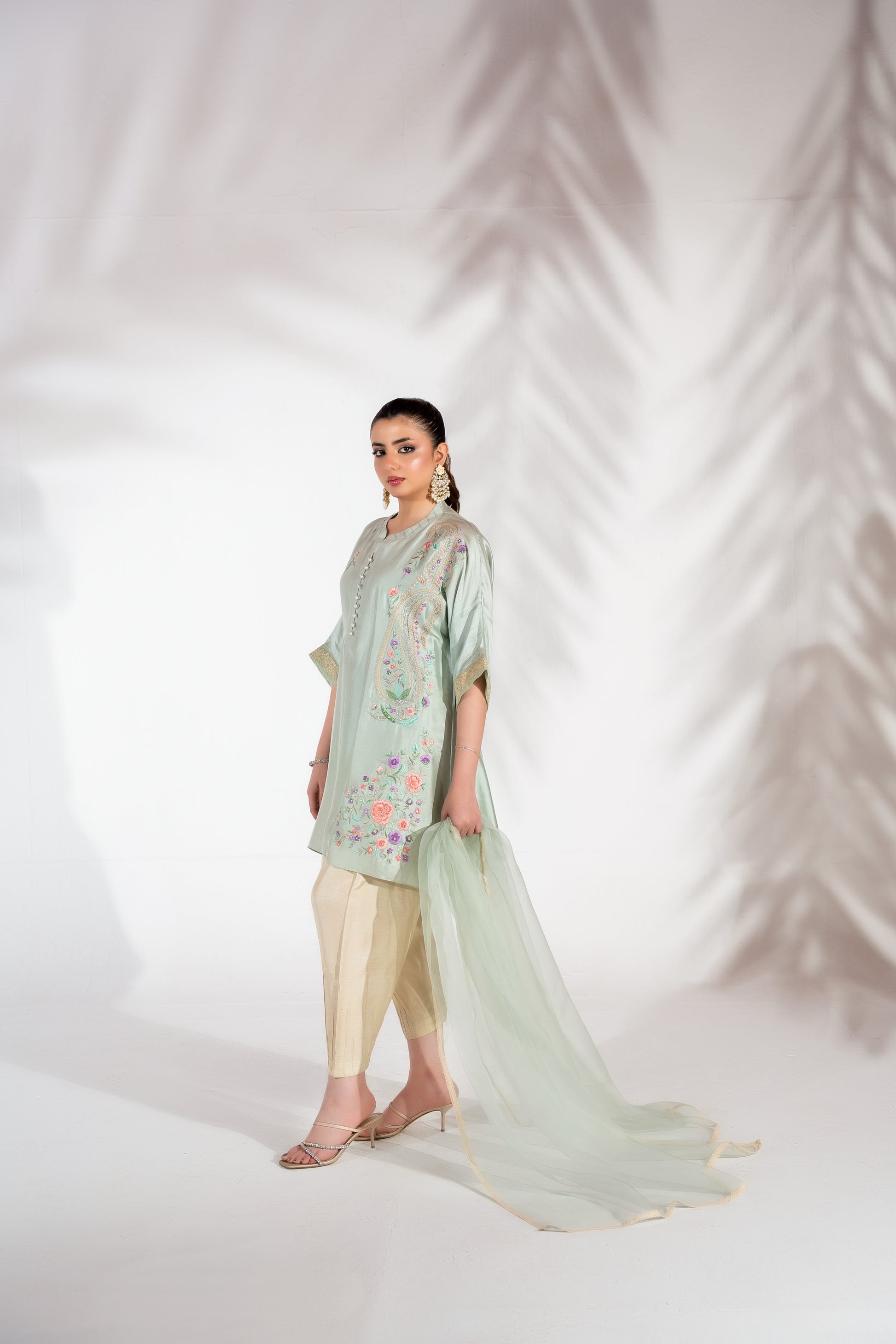 A refreshing mint-toned ensemble adorned with detailed paisley couture embroidery, meticulously handcrafted across the front. Subtle organza accents enhance the sleeves, creating dimension and texture. Paired with a chic pleated ivory shalwar, a slip and a coordinated organza dupatta finished with delicate lace edging, this look embodies timeless elegance with a modern sensibility.
