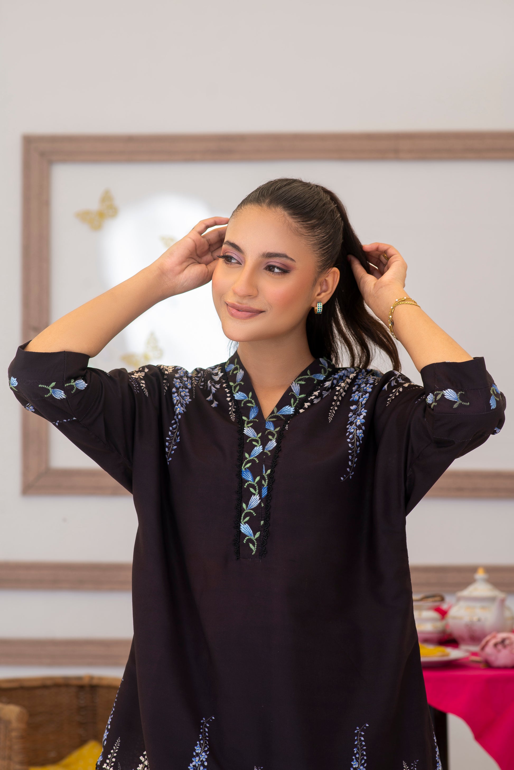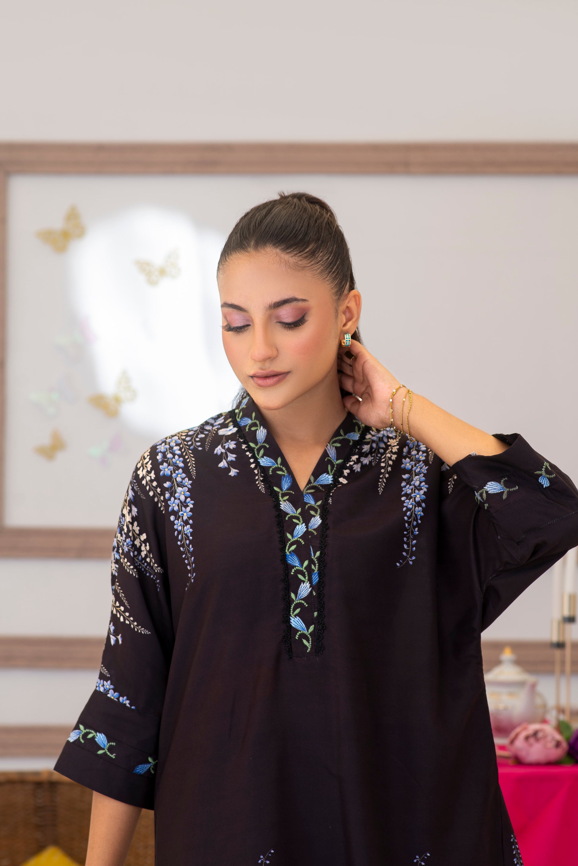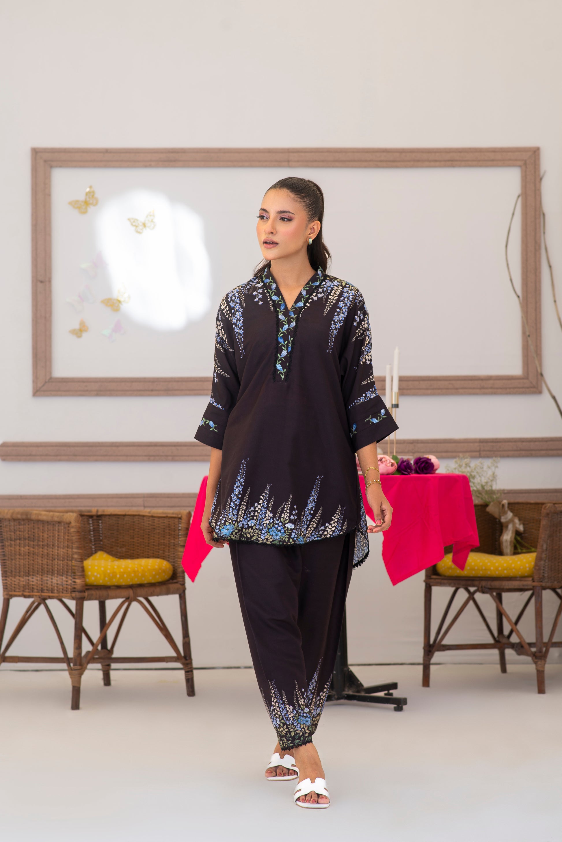 The kurta is designed in a rich black base, adorned with cascading floral motifs in cool shades of blue, green, and white, giving it an elegant yet refreshing appeal. It is paired with a matching shalwar that carries the same floral detailing at the hem, completing the coordinated look.