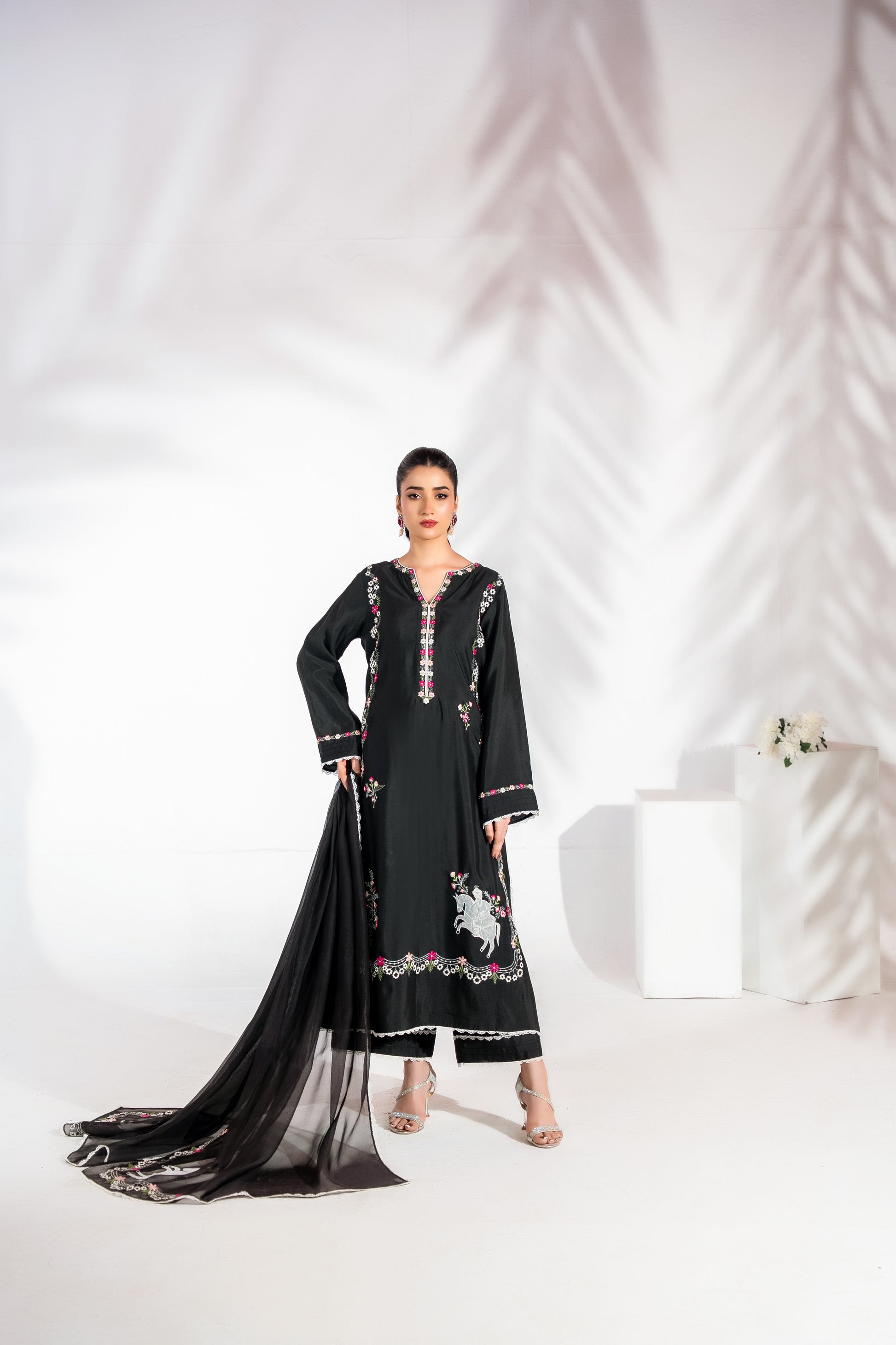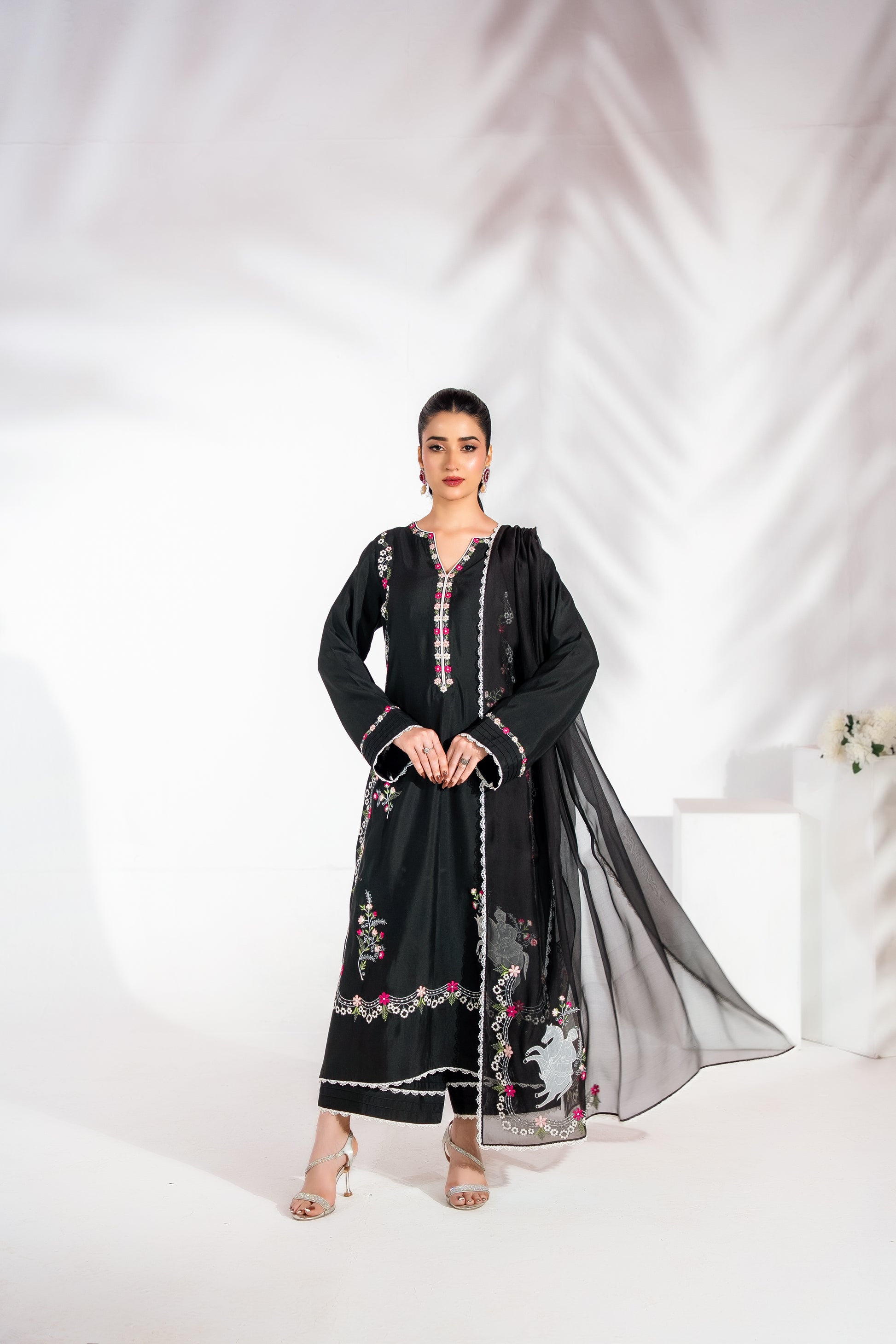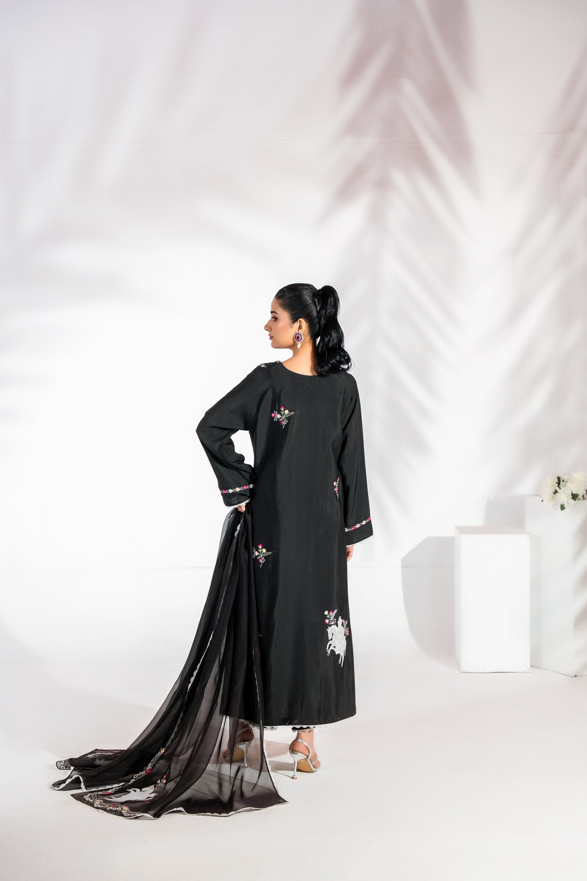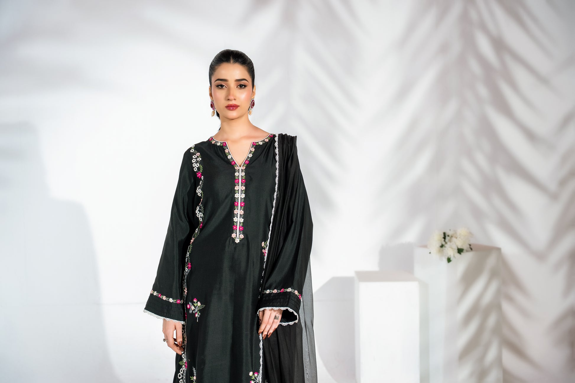 A timeless black statement, Black Rosette is elevated with delicate floral embroidery accented with soft ivory hues. Handcrafted with stone, kut dana and dabka embellishments it adds texture and refined brilliance. The silhouette is paired with an embroidered dupatta finished with lace detailing, creating a graceful interplay of depth and detail.
