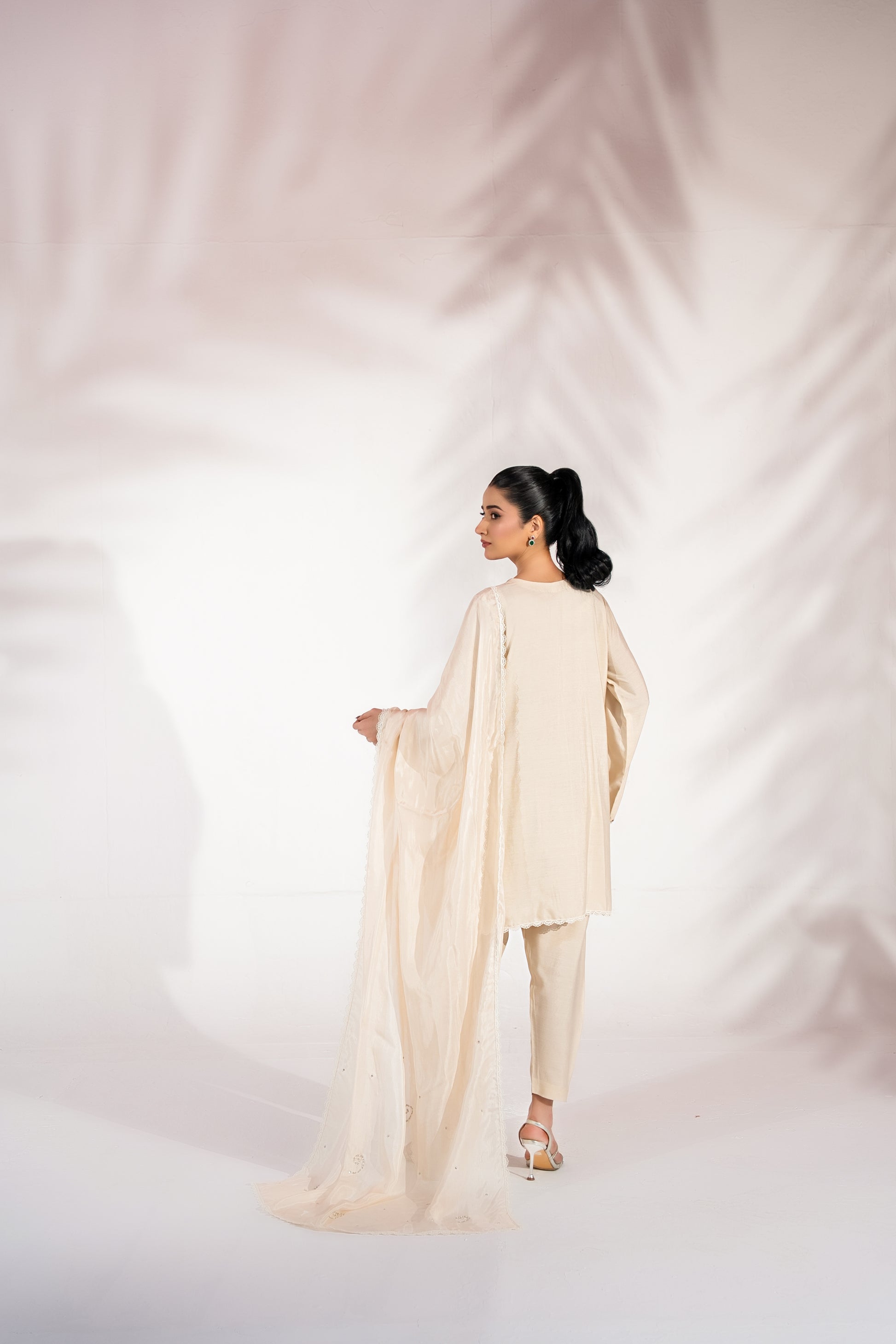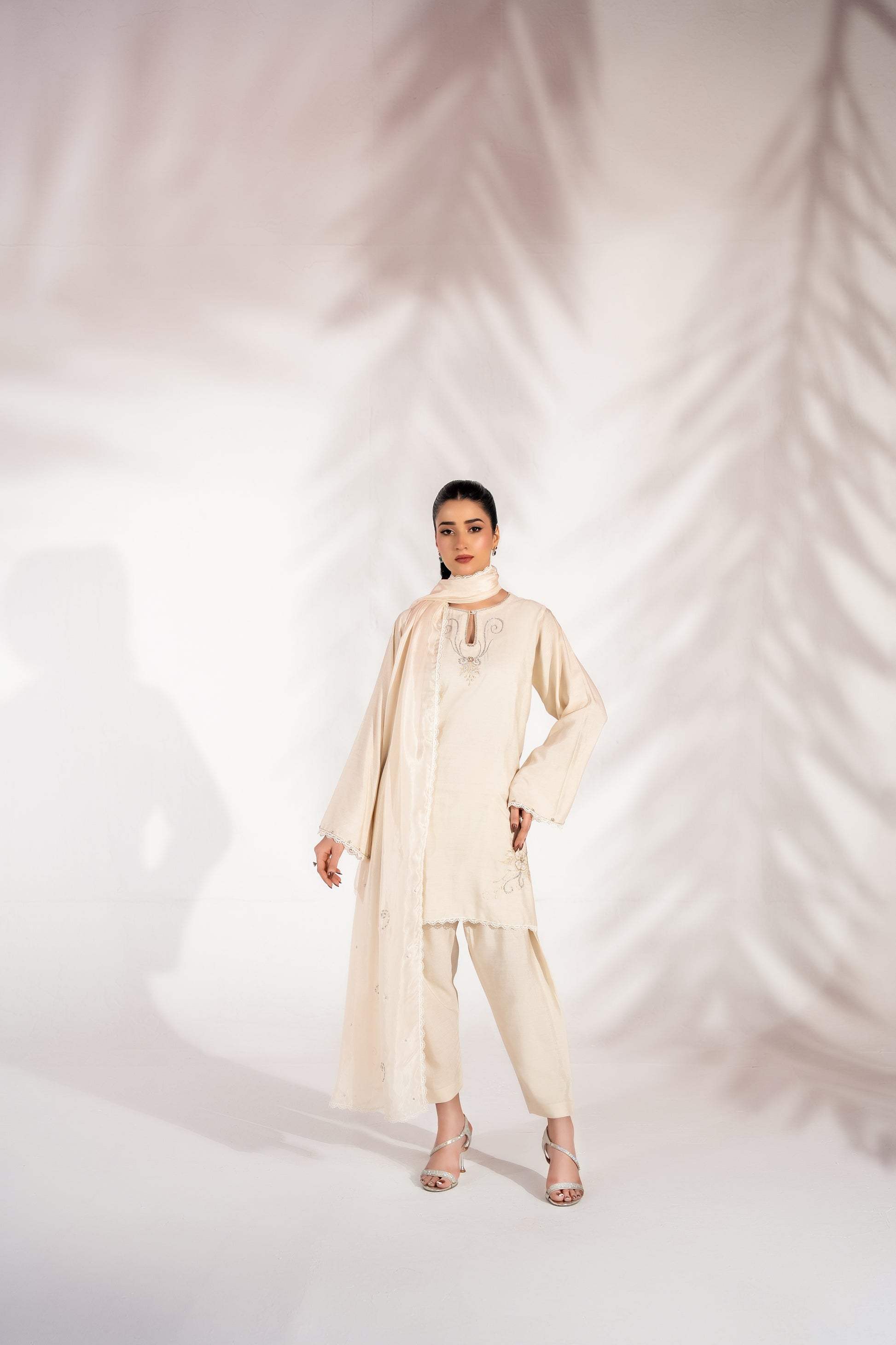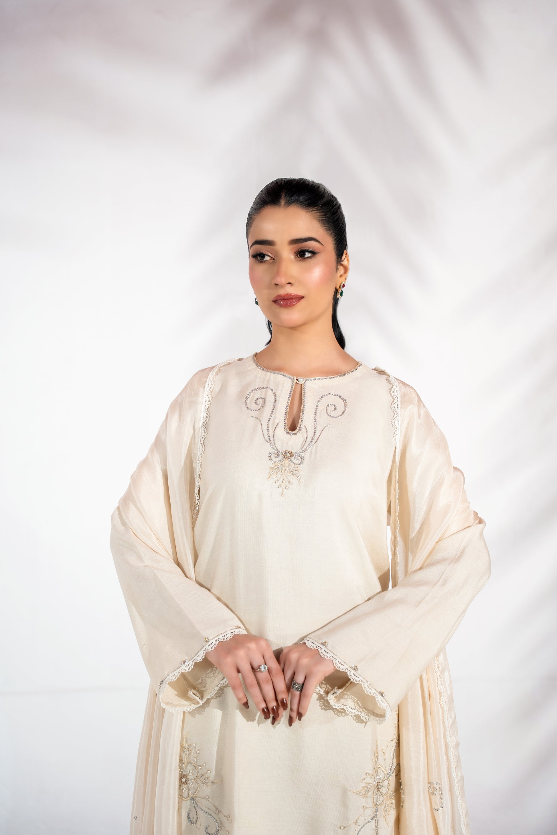 An ivory-toned vision of sophistication, Cloud Dance is adorned with intricate hand thread work, delicately embellished with fine kut dana, pearls, stones and dabka detailing. The silhouette flows effortlessly, paired with a sleek shalwar that enhances its refined aesthetic. A matching silk dupatta, finished with subtle floral motifs along the pallu, adds graceful movement and timeless charm to this ethereal ensemble.