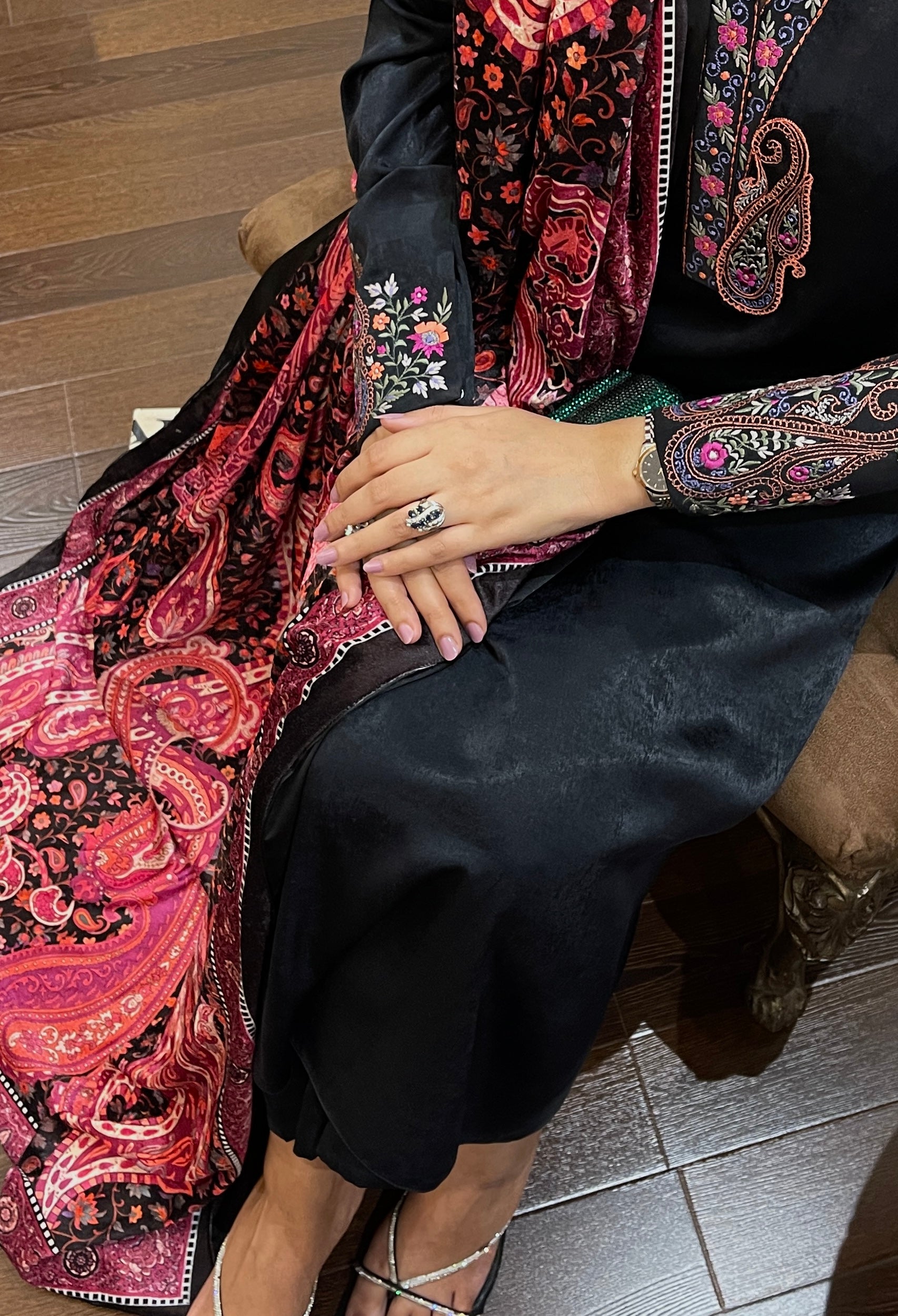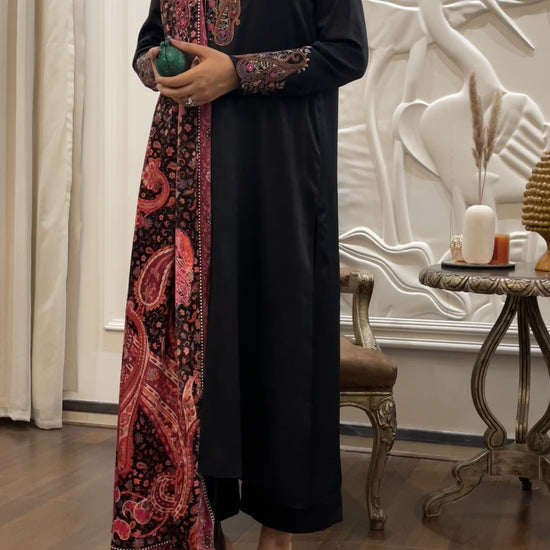 This classic three-piece ensemble that captures winter in the air, crafted in self velvet silk. The two piece outfit features intricate couture paisely embroidery on the neckline and sleeves paired with graceful wide leg pants.
