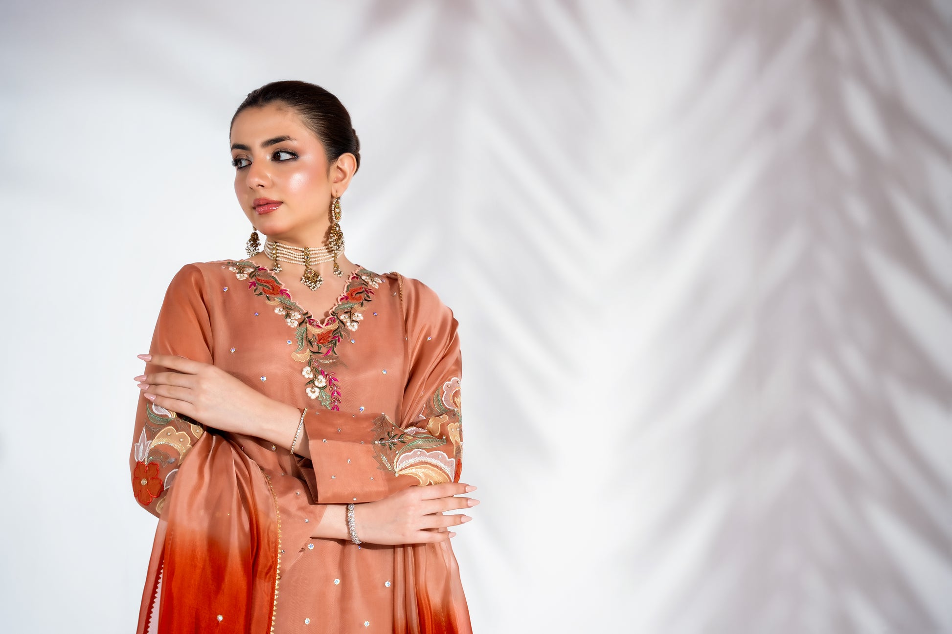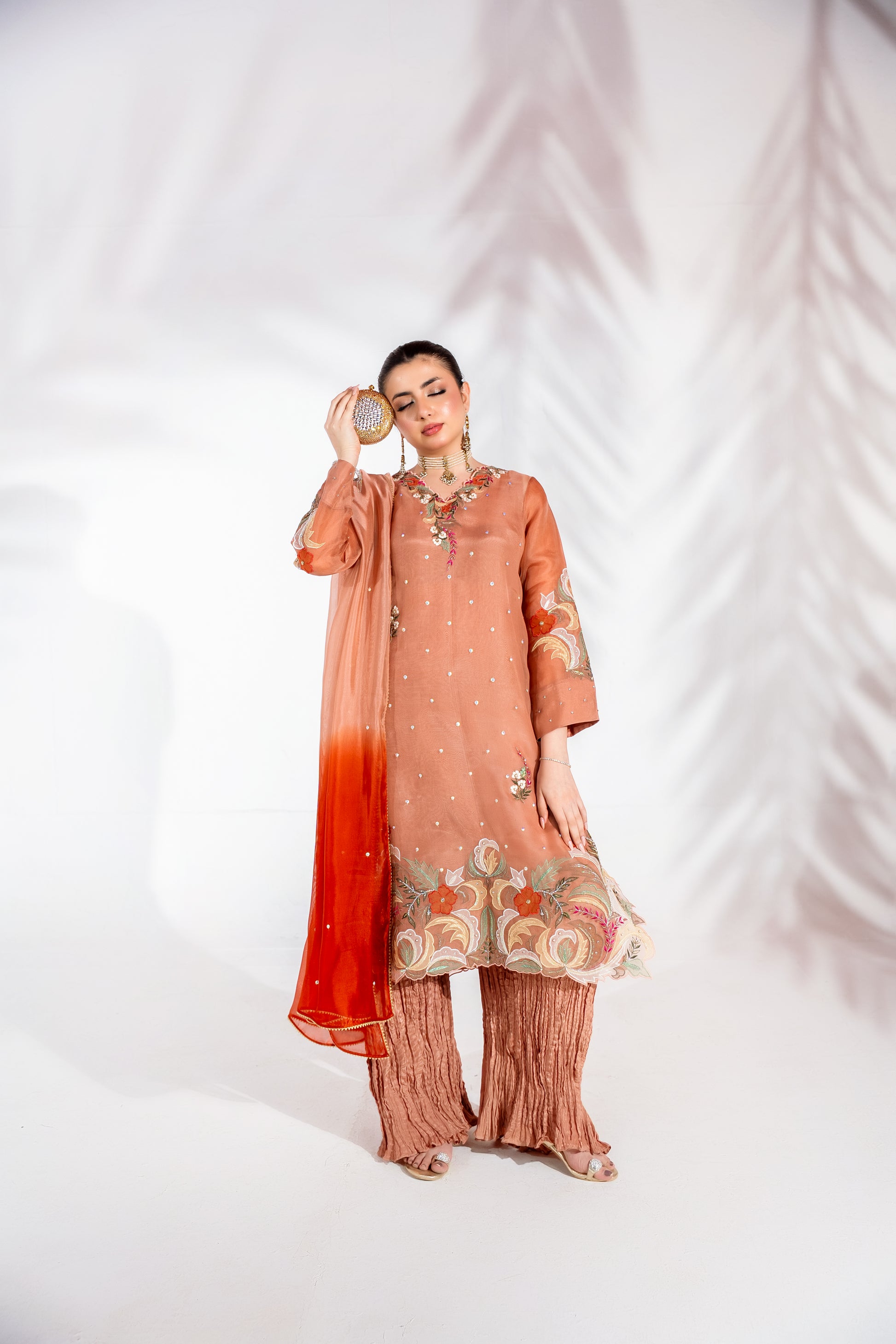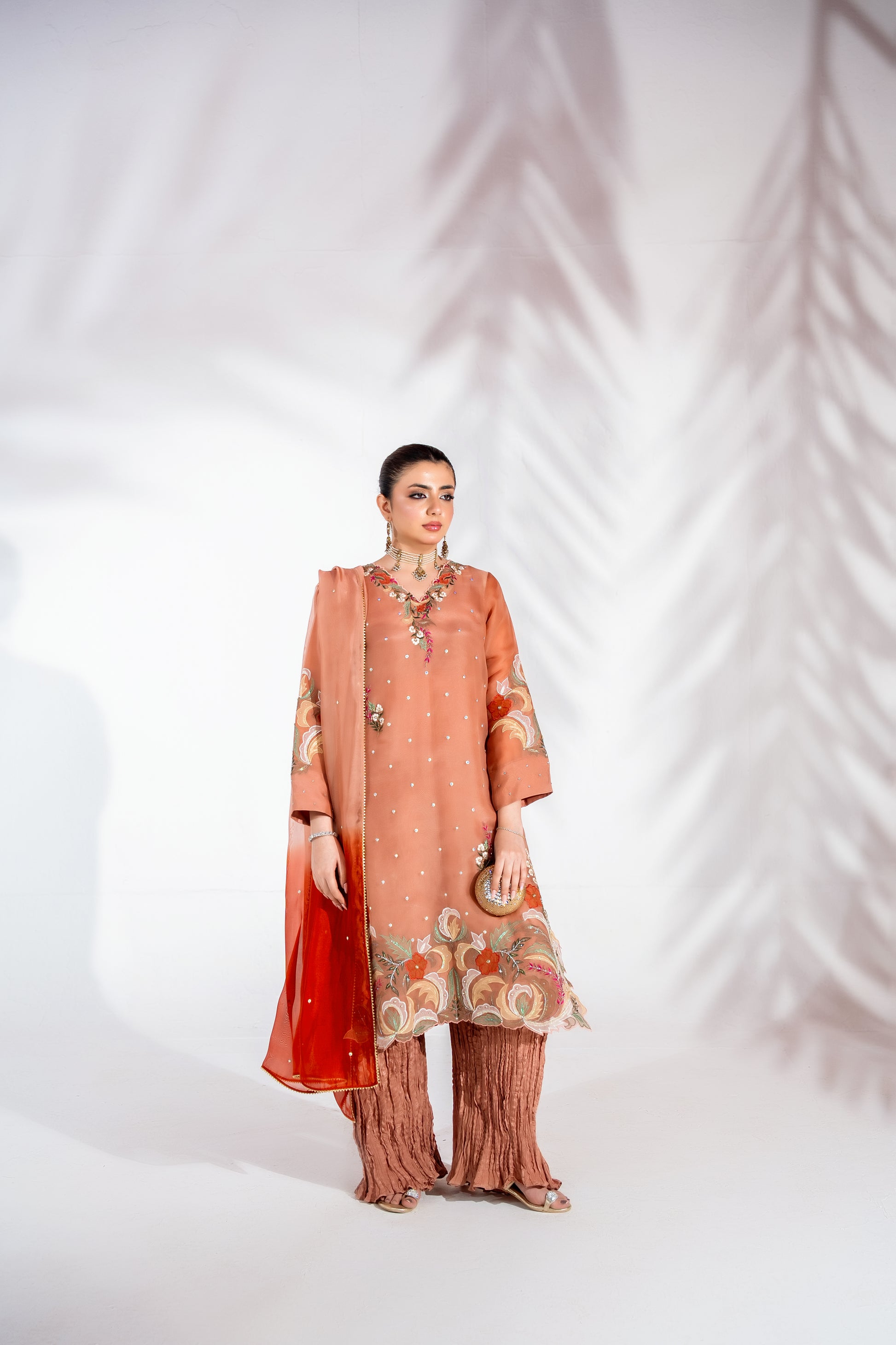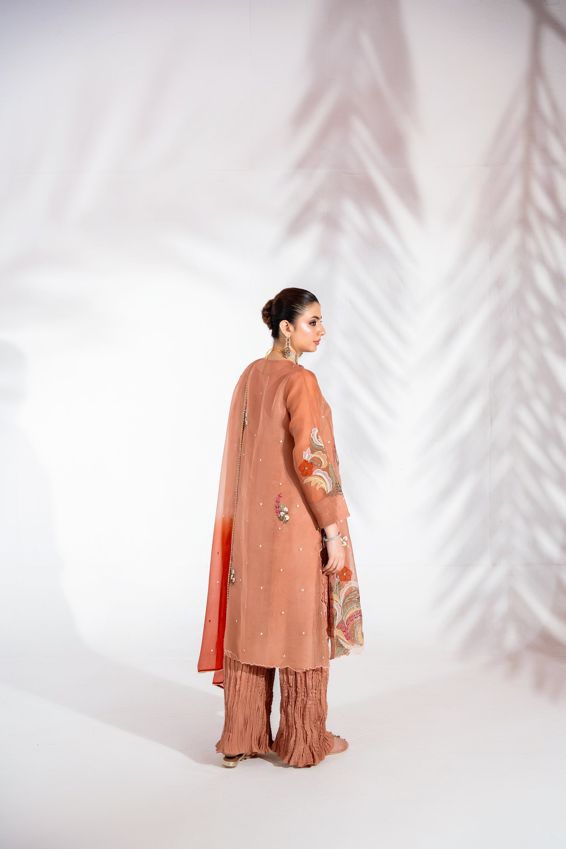 This dusky peach tone ensemble is a refined expression of understated luxury. Crafted in pure organza, the loose-cut kurta features delicate appliqué work with hand-finished embellishments such as cut dana, dabka, pearls, stones and lurex, beautifully complemented by intricately embroidered borders for added depth and dimension.