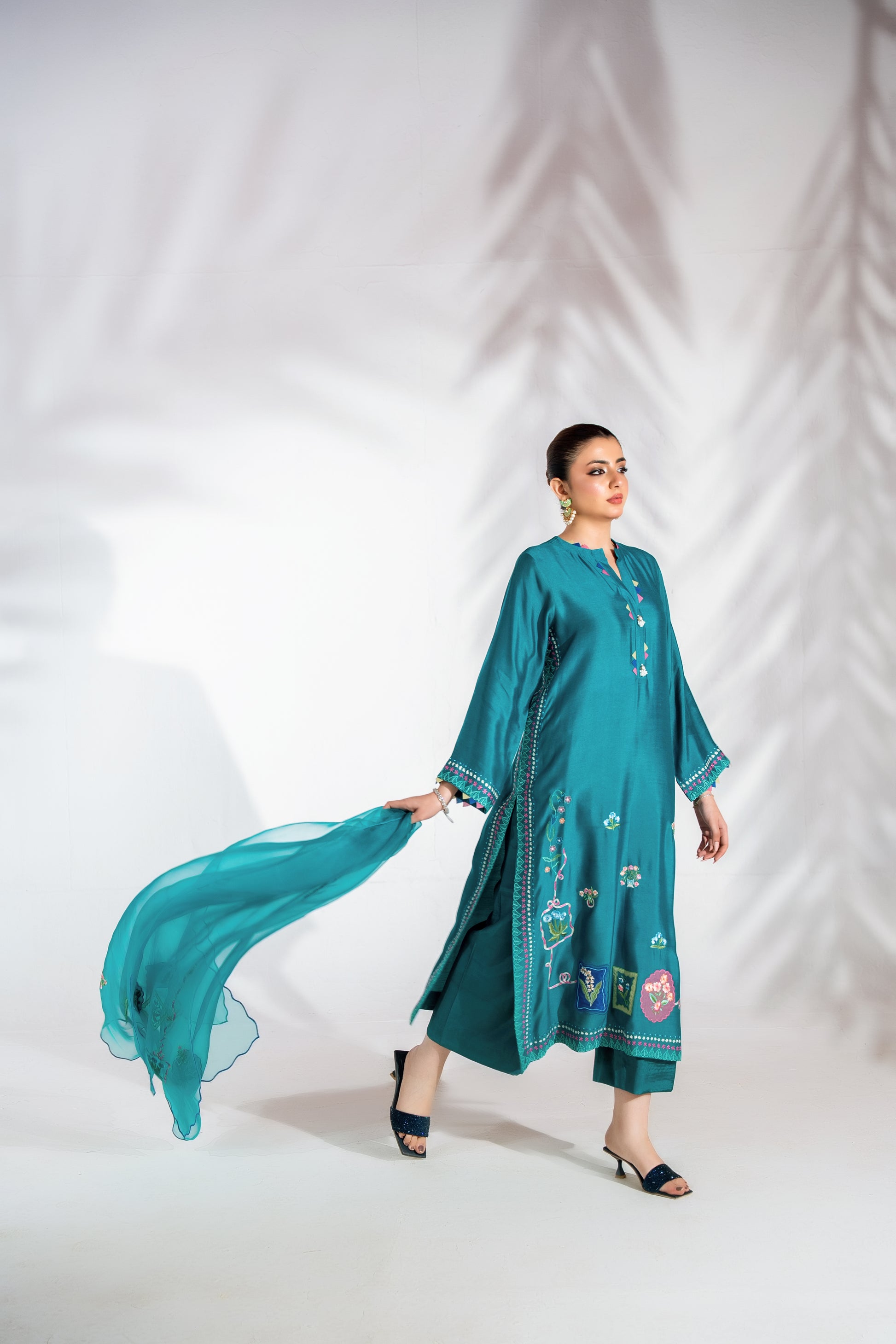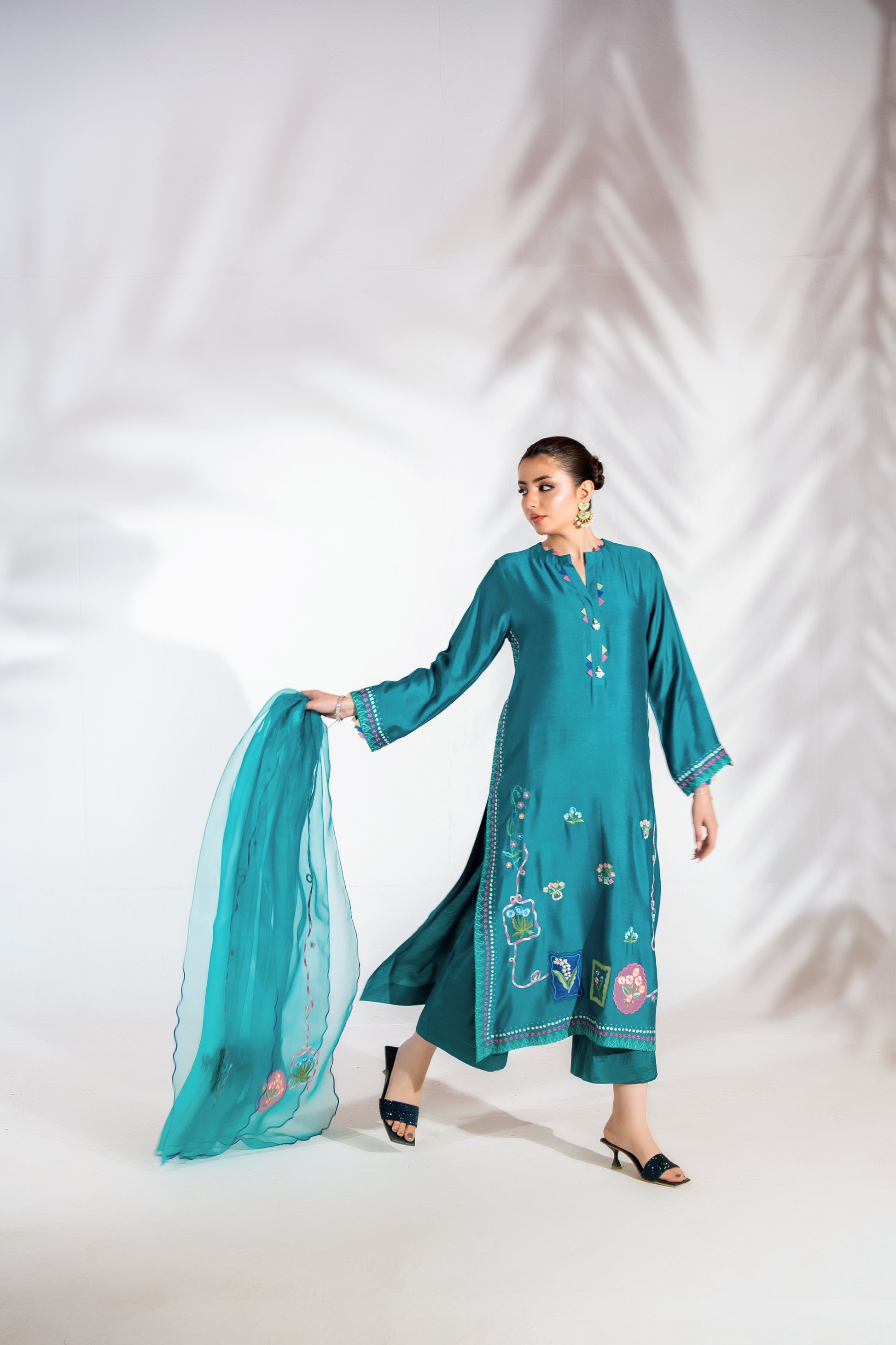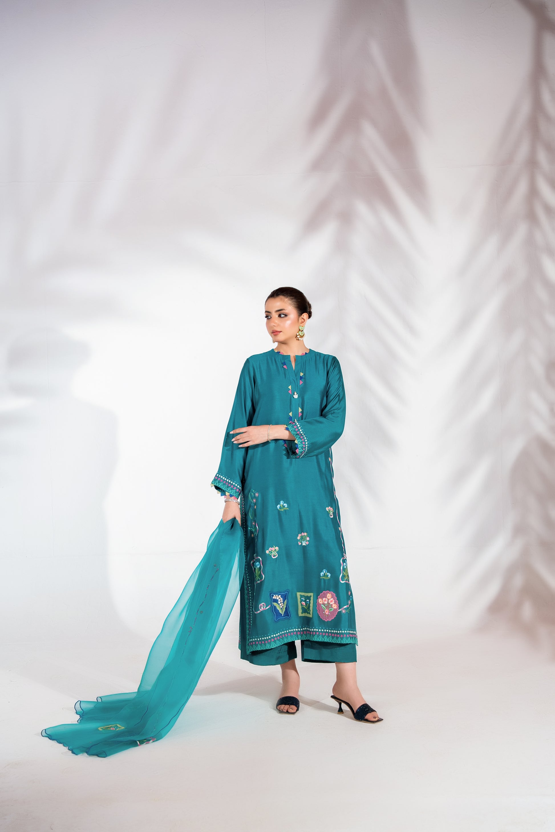Blending modern elegance with effortless grace, this teal ensemble features handcrafted embroidery with applique work that defines its sleek silhouette. The fluid dupatta adds movement and softness, while wide-leg pants complete the look with contemporary refinement. A statement piece designed for elevated festive dressing.