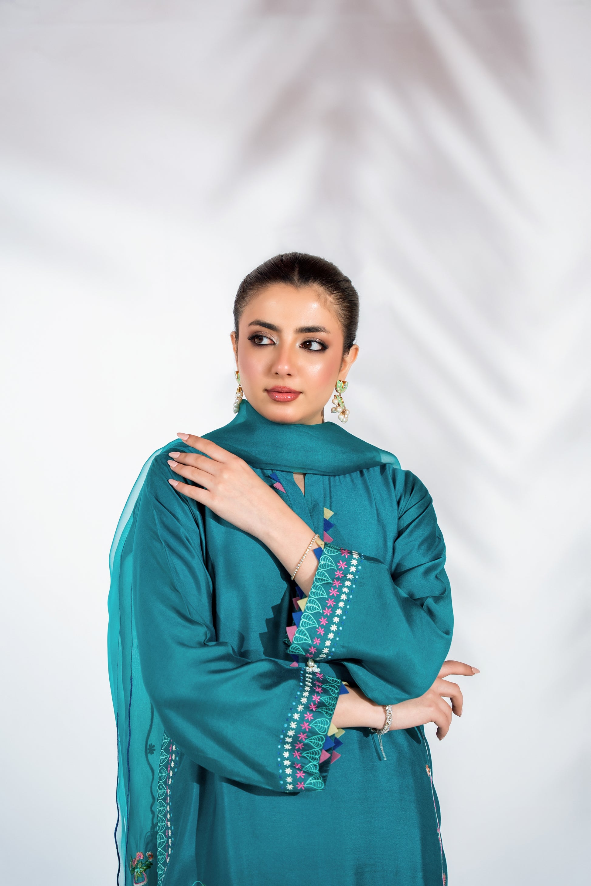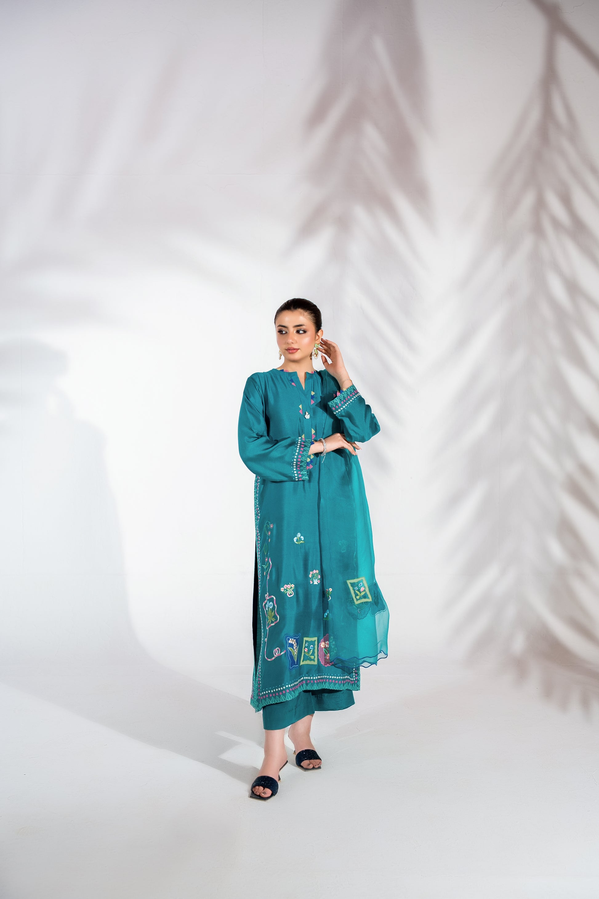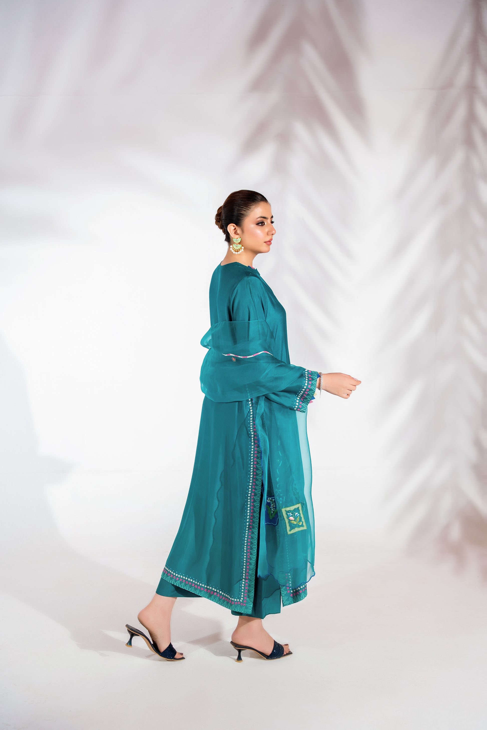 Blending modern elegance with effortless grace, this teal ensemble features handcrafted embroidery with applique work that defines its sleek silhouette. The fluid dupatta adds movement and softness, while wide-leg pants complete the look with contemporary refinement. A statement piece designed for elevated festive dressing.