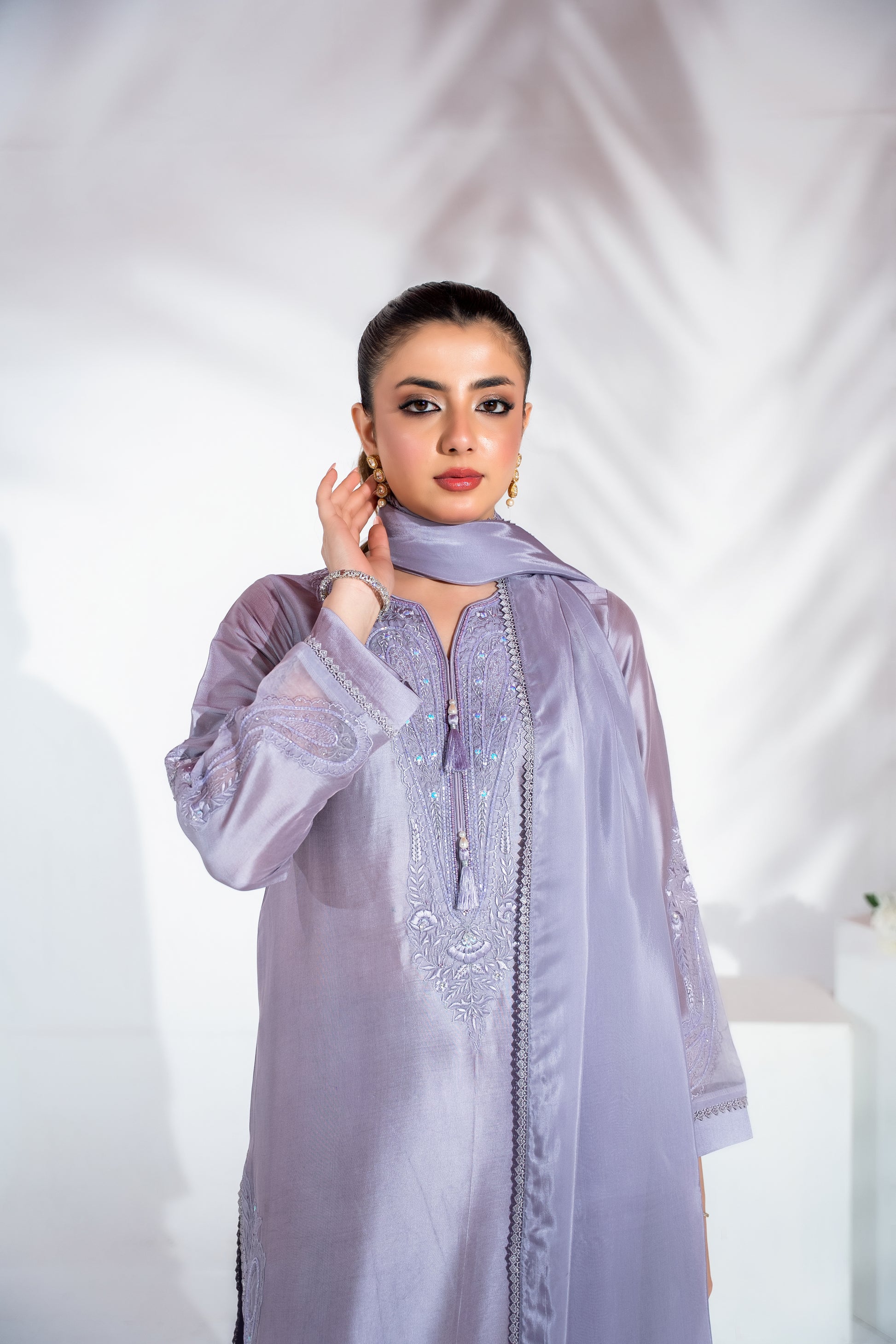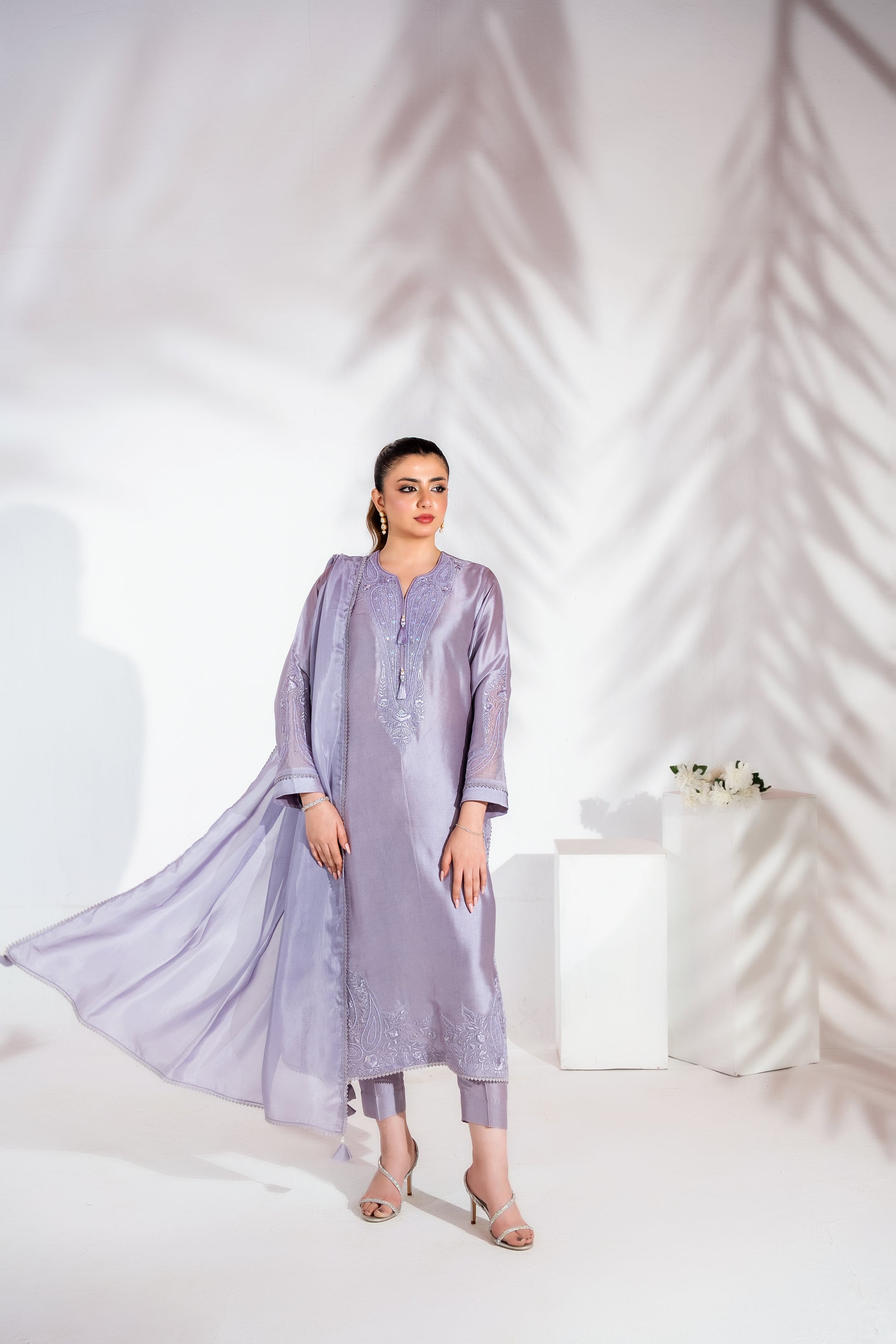 Soft and refined, Lavender Mist is crafted in luxurious butter silk and adorned with pastel tonal embroidery along the neckline, sleeves and hem. This straight long shirt is paisely tonal embroidered piece. Hand embellishments like sequins, kut dana and stones add a subtle shimmer to the silhouette. Paired with tailored straight pants and a coordinated silk dupatta, this ensemble reflects delicate sophistication.