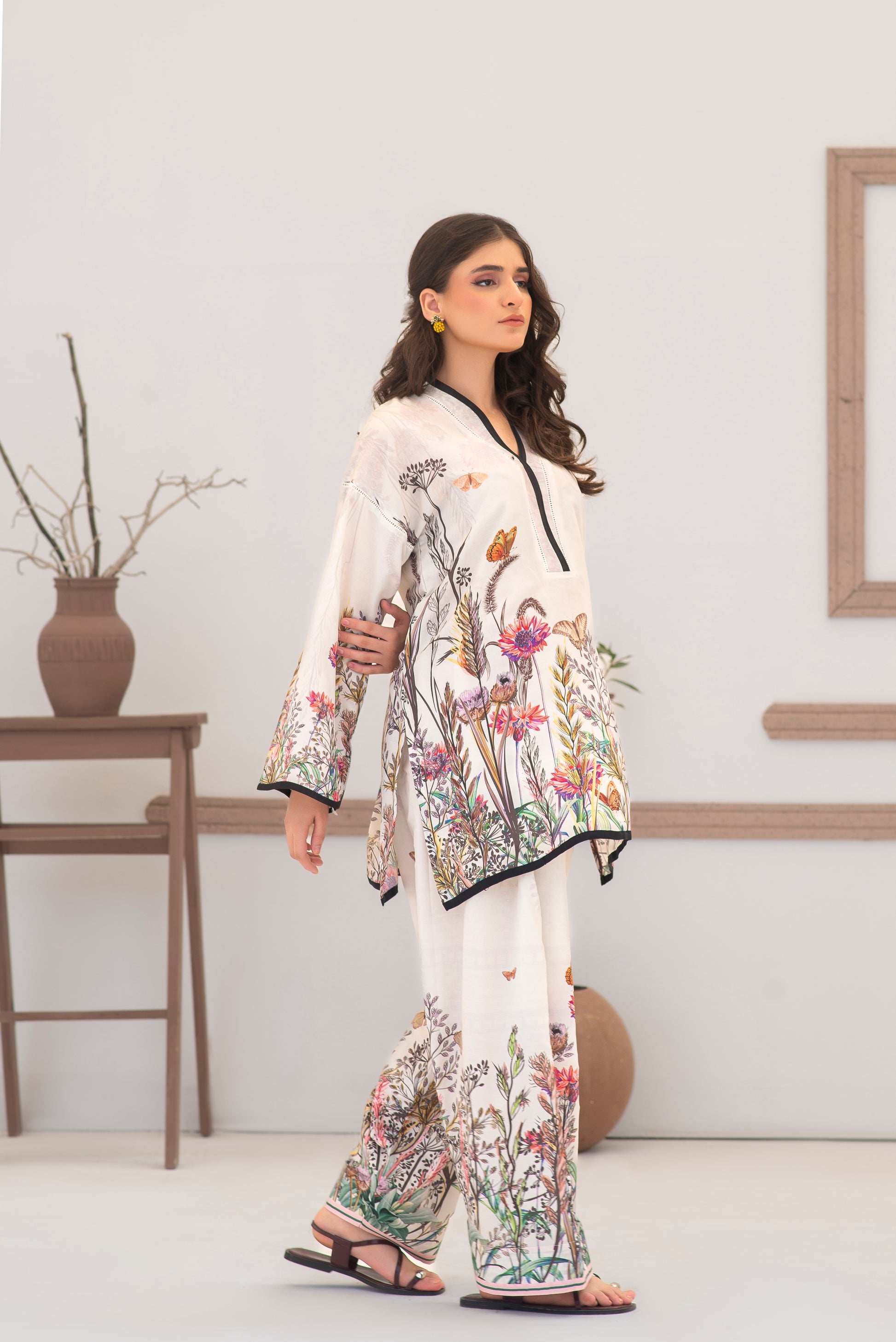 The modern cut shirt features a sleek black trim on the neckline and cuffs, adding a bold, structured contrast to the soft floral patterns. Paired with a flowy shalwar detailed in matching prints, it creates a sophisticated yet effortless look.