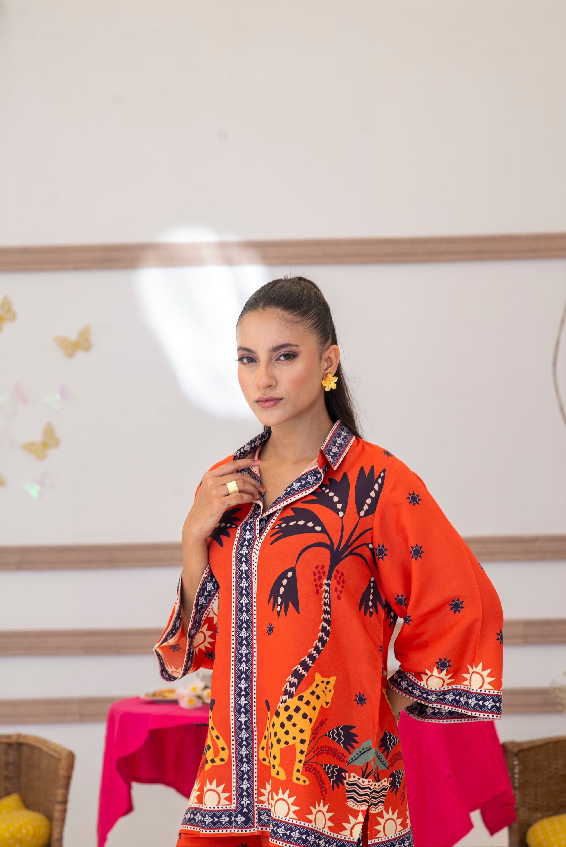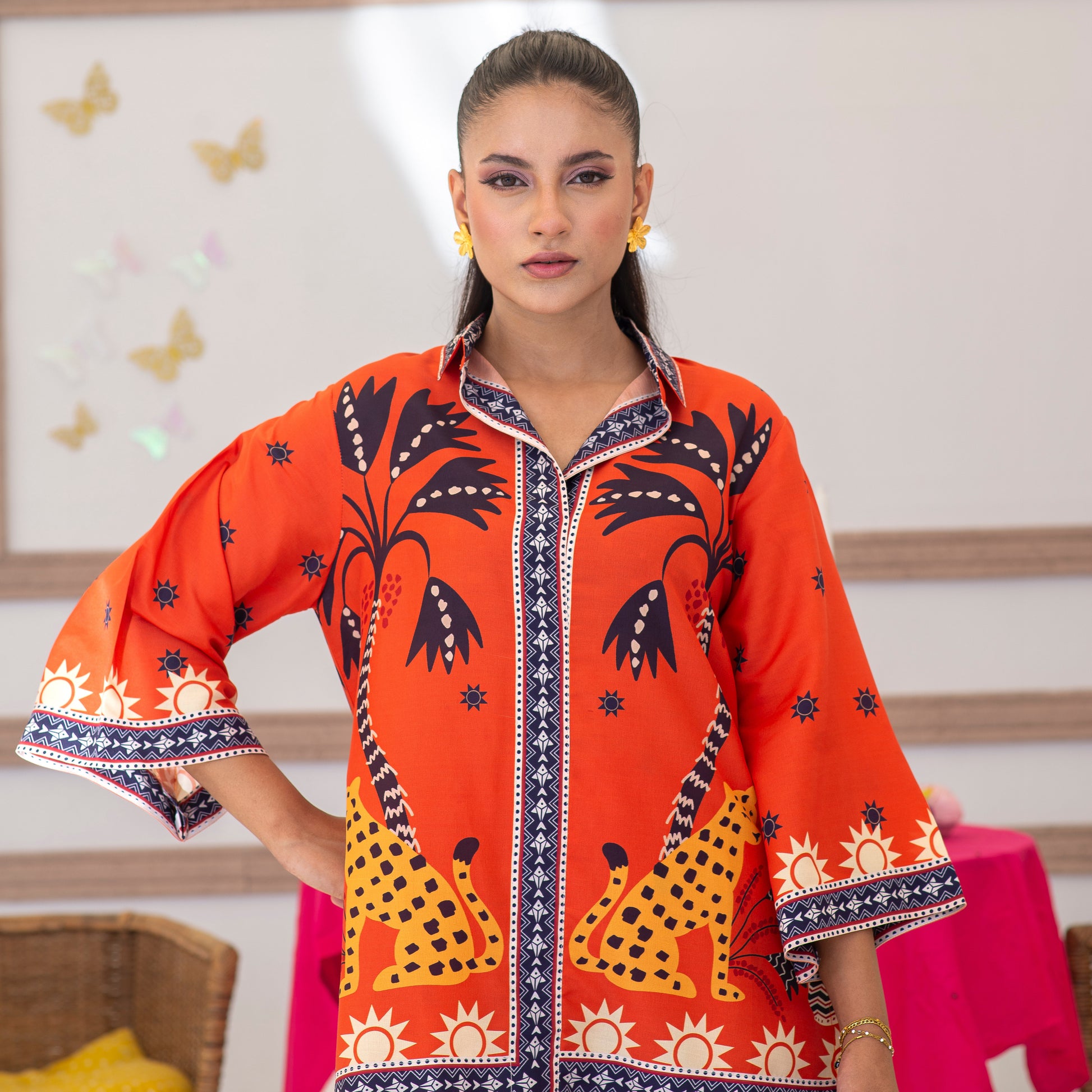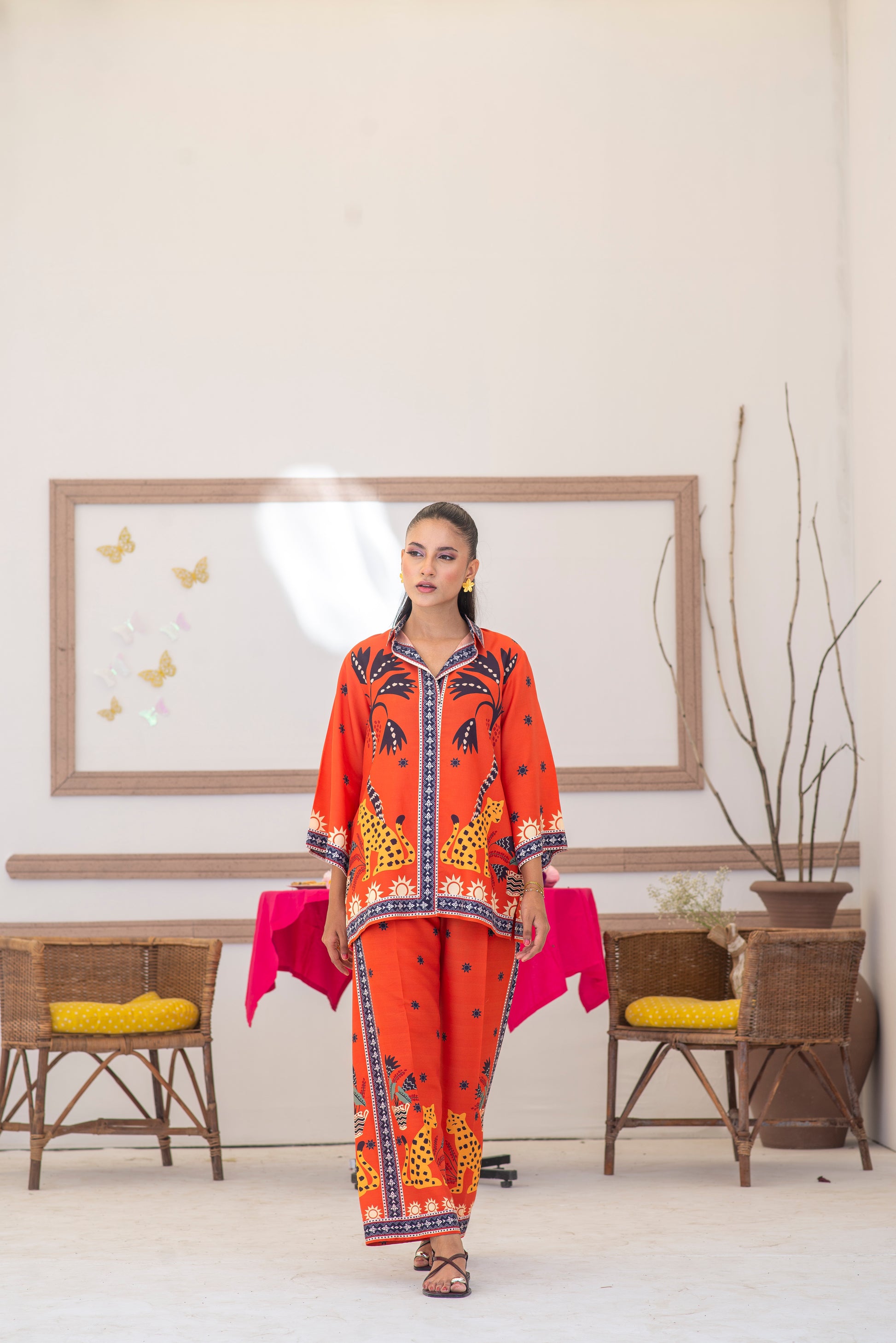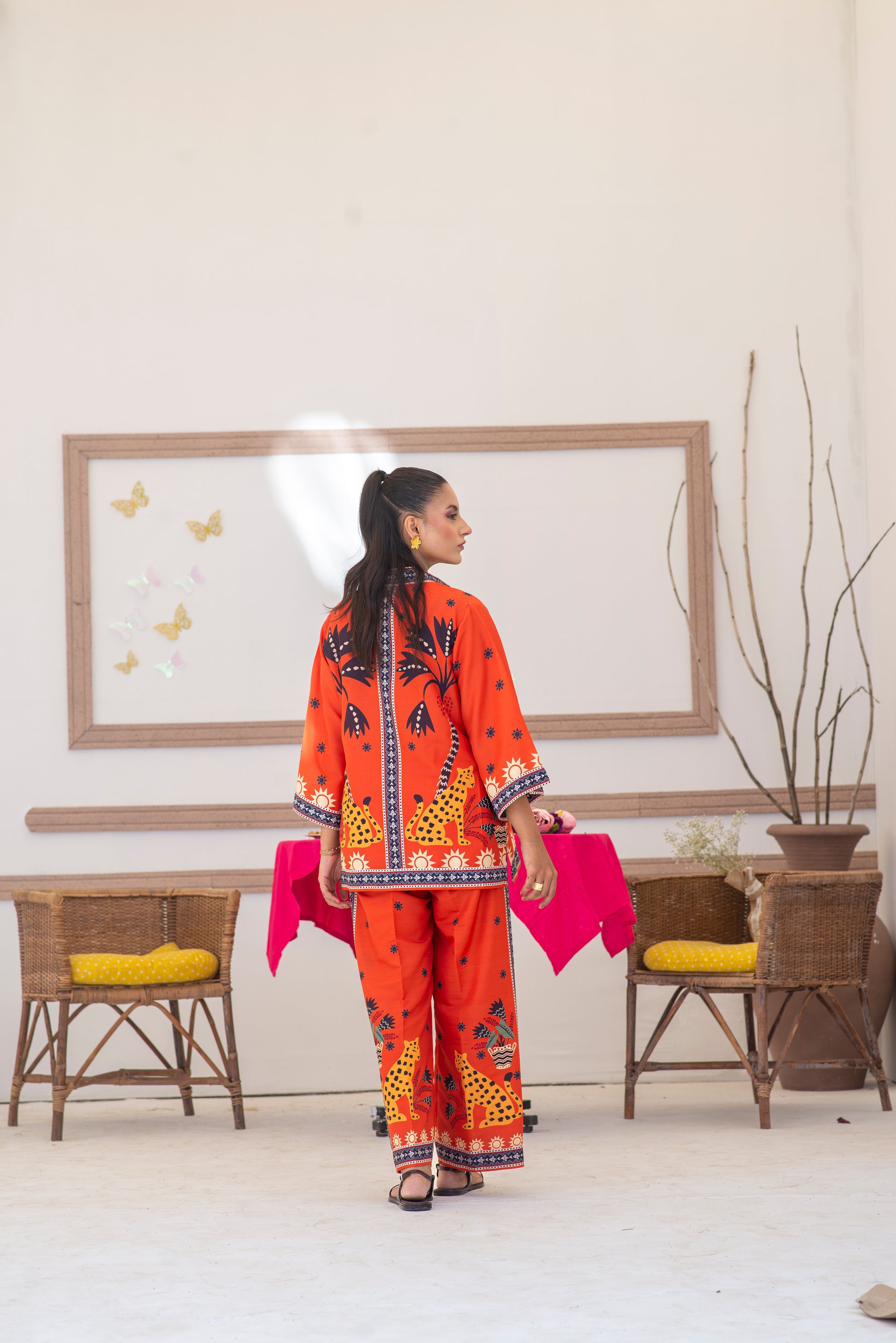 This bold two-piece set captures the wild spirit of the savannah with its burnt orange base and majestic cheetah motifs framed by artistic palm accents. The synergy of coordinated prints creates a powerful yet graceful ensemble that makes a statement at any gathering.