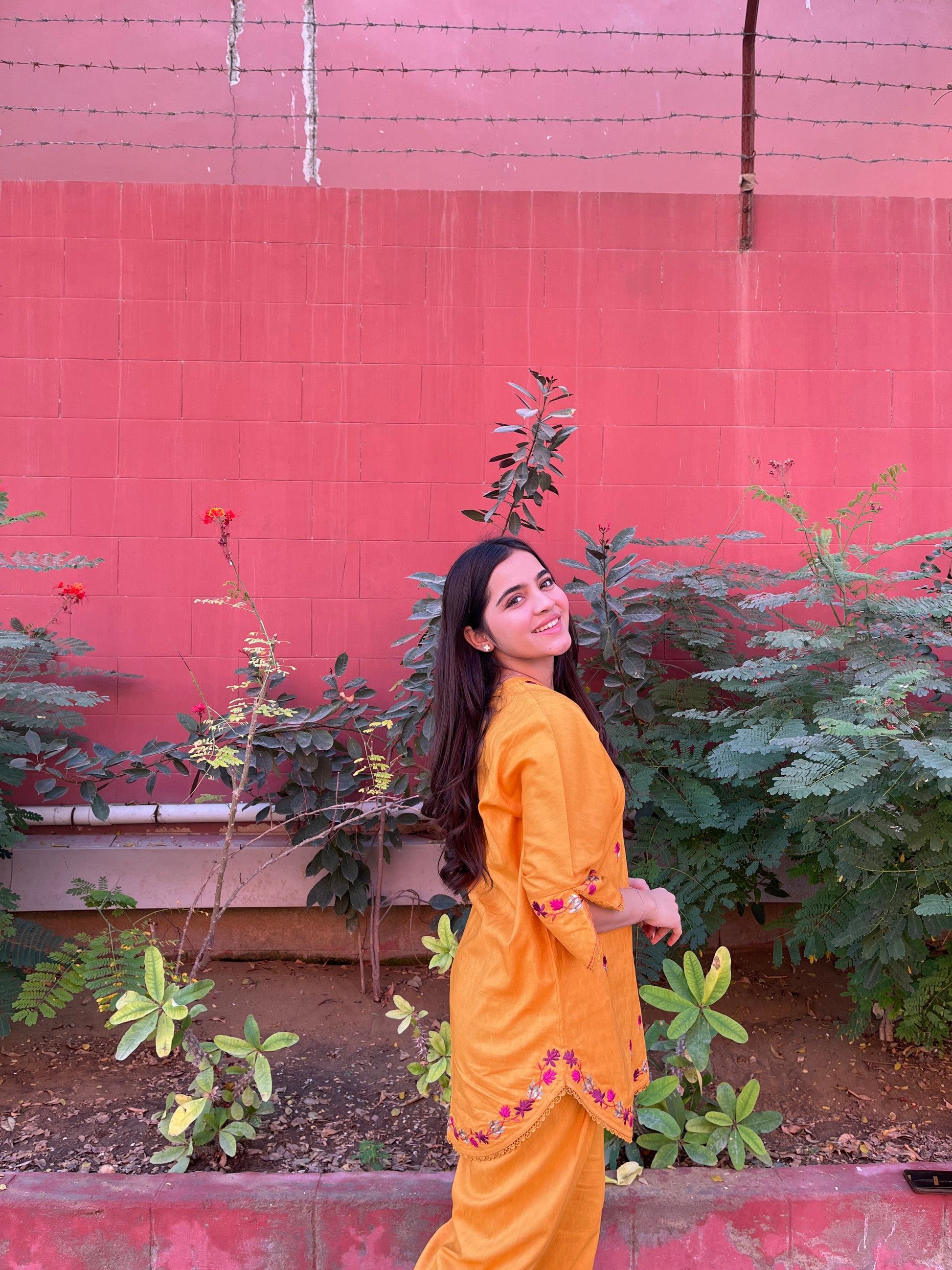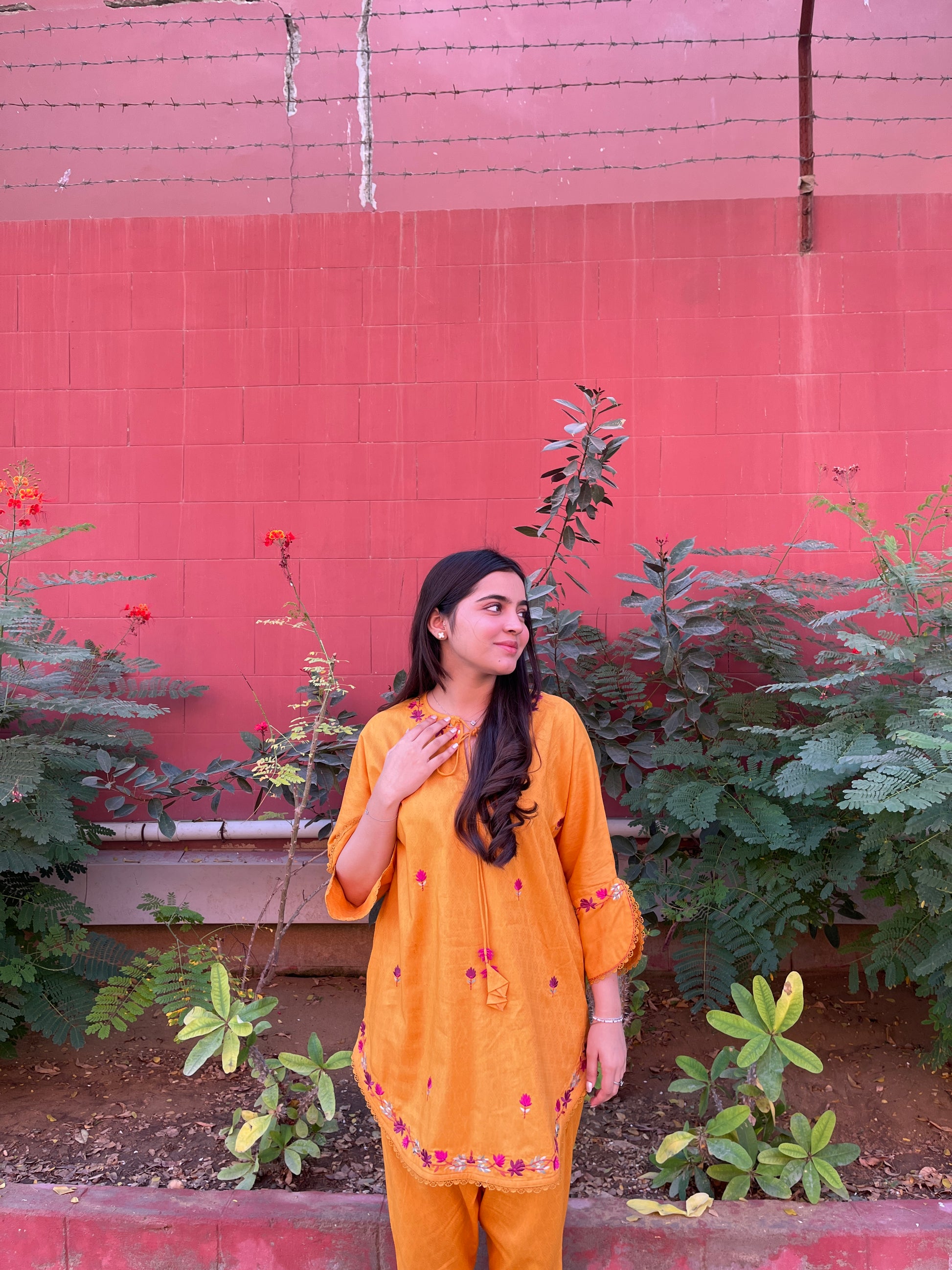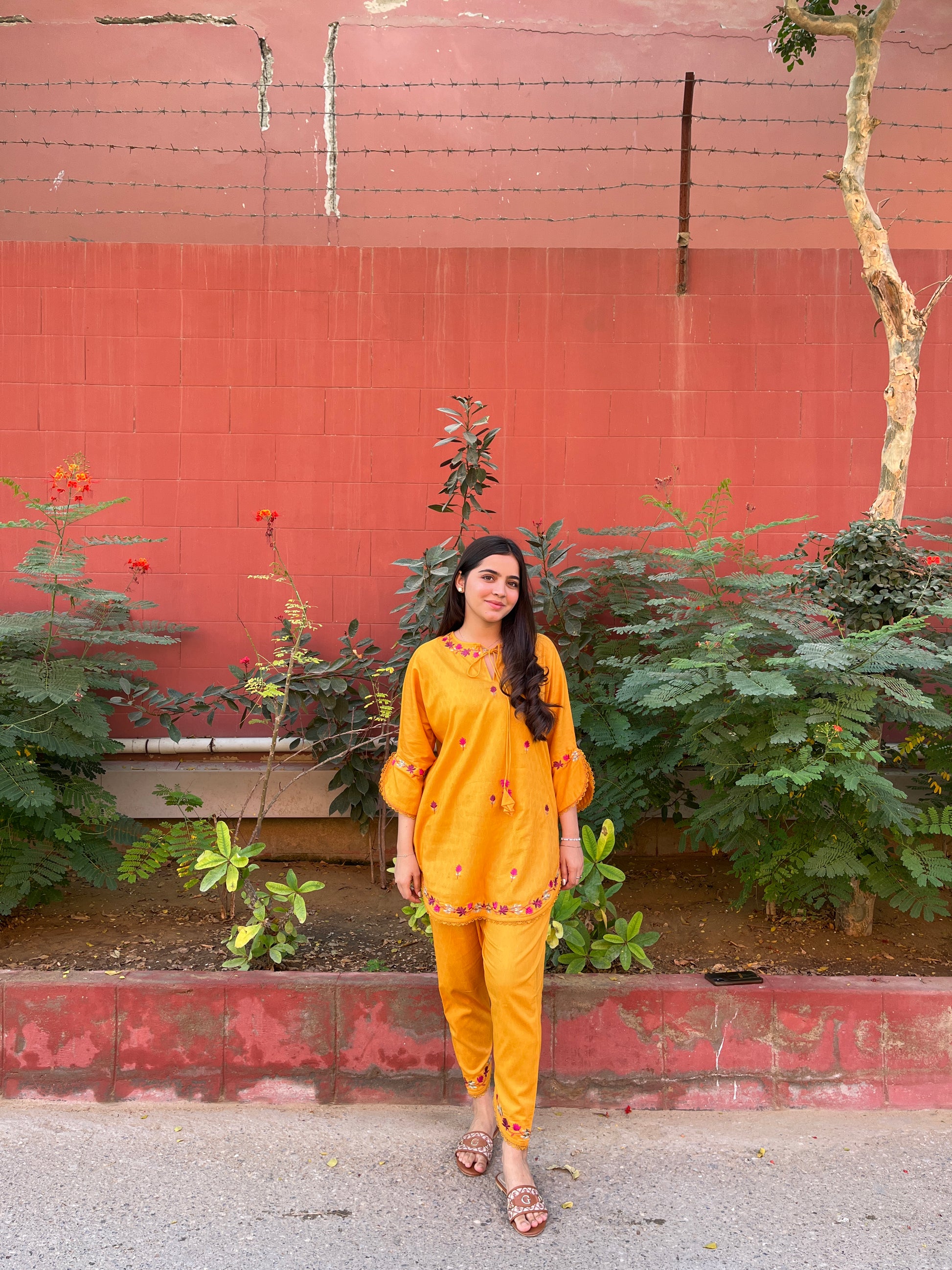 Sunshine is a yellow mango dobby jacquard cord set with intricate resham embroidery featuring a boxcut shirt with skinny shalwar, finished with resham tassles. Making it low key effort for any lunch.