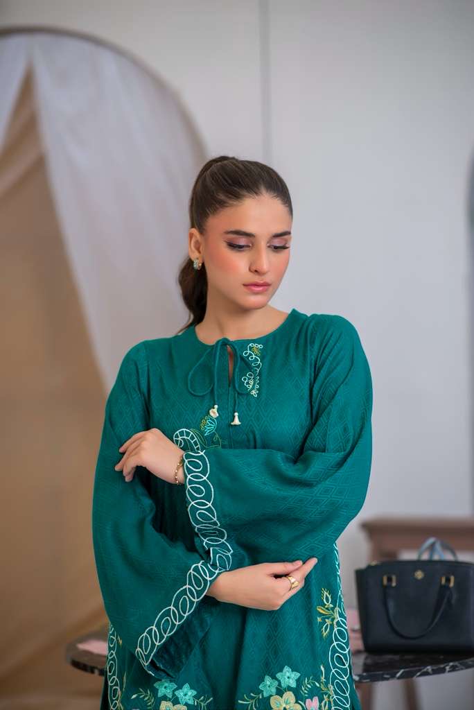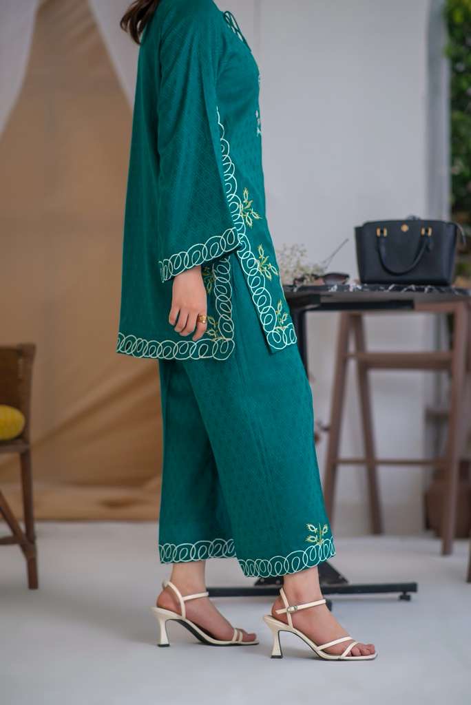 Teal Whisper is a jacquard cotton cord set which intricate floral embroidery on the hem and sleeves. Trouser adds a classic touch to the modern outfit.